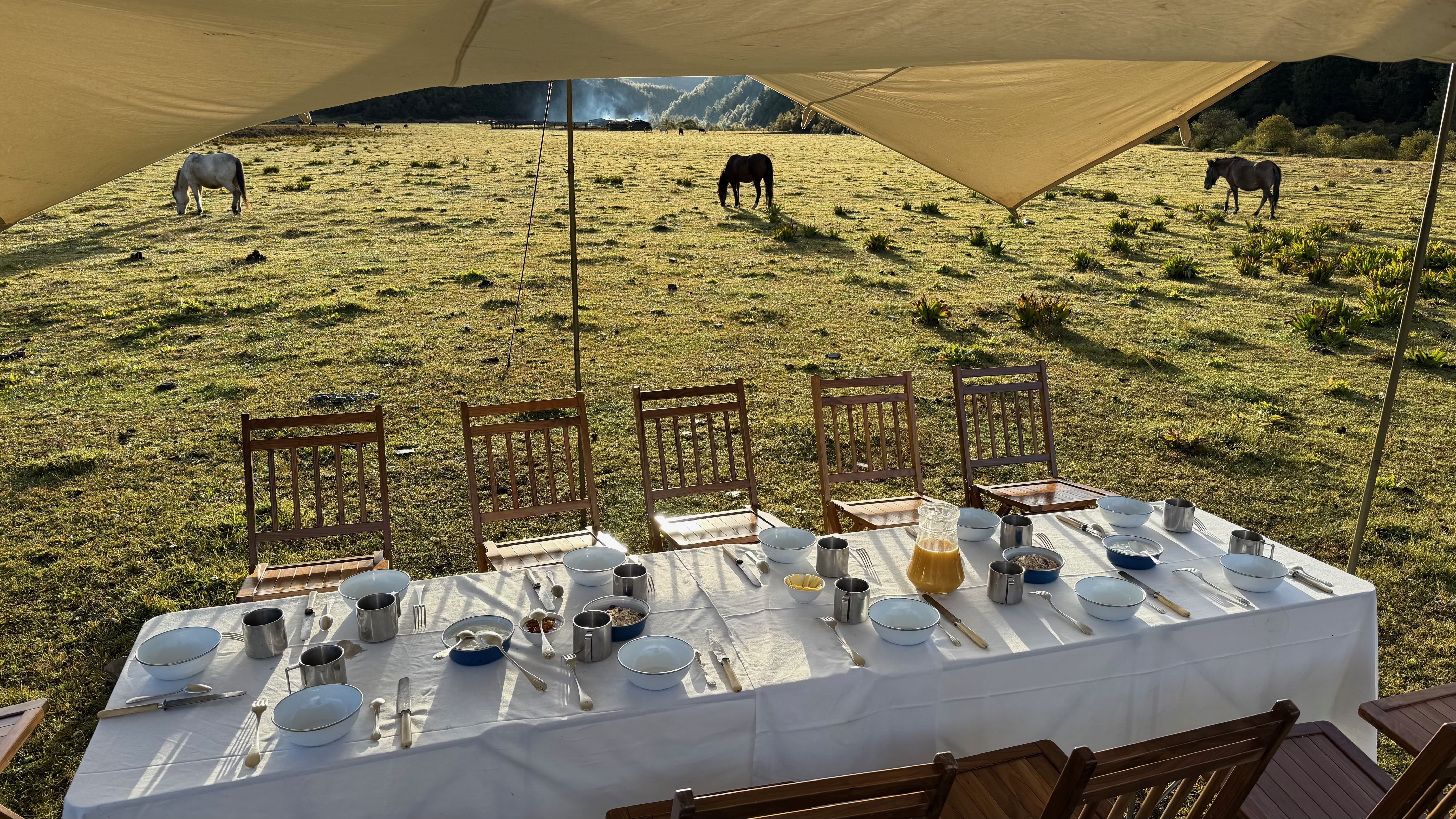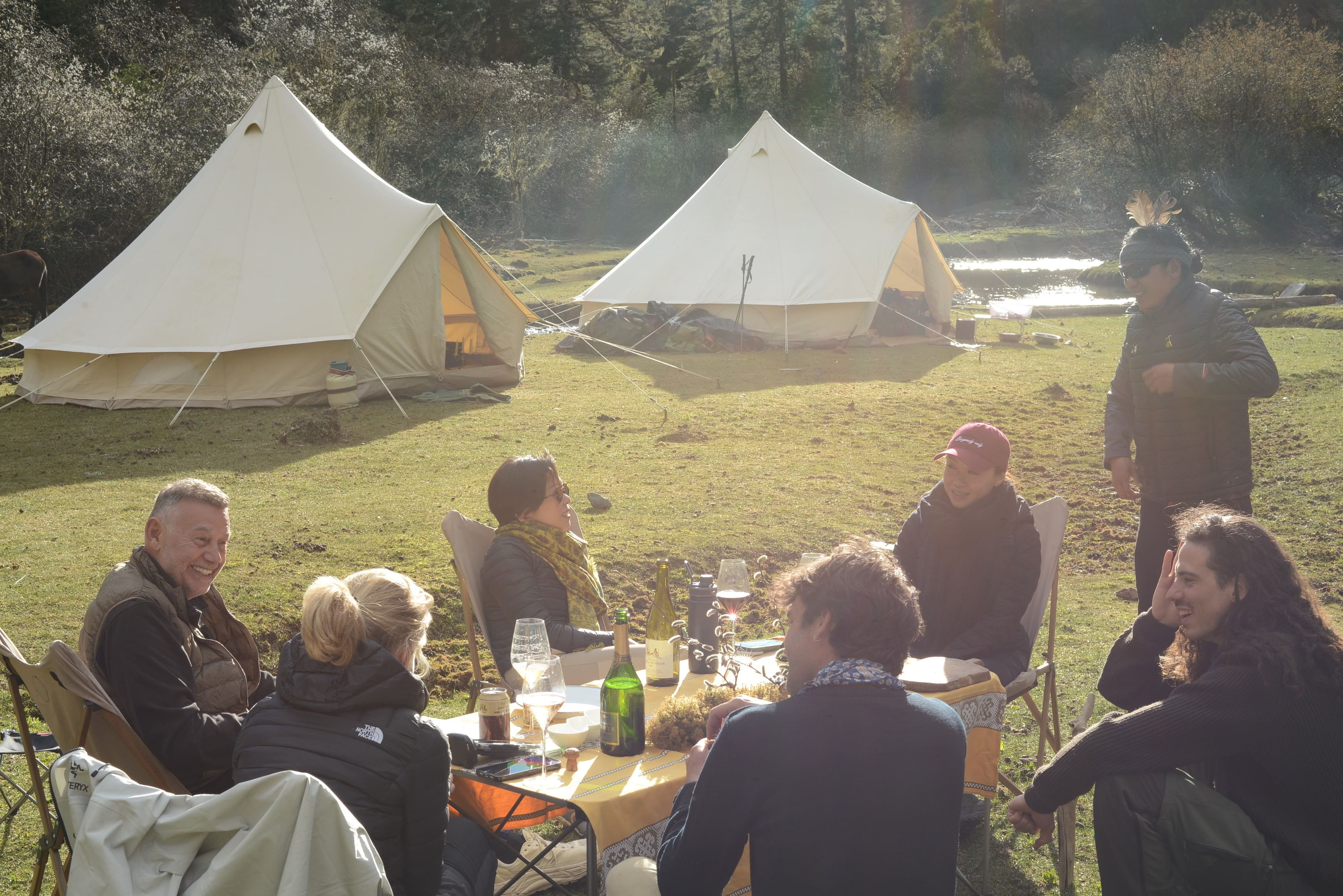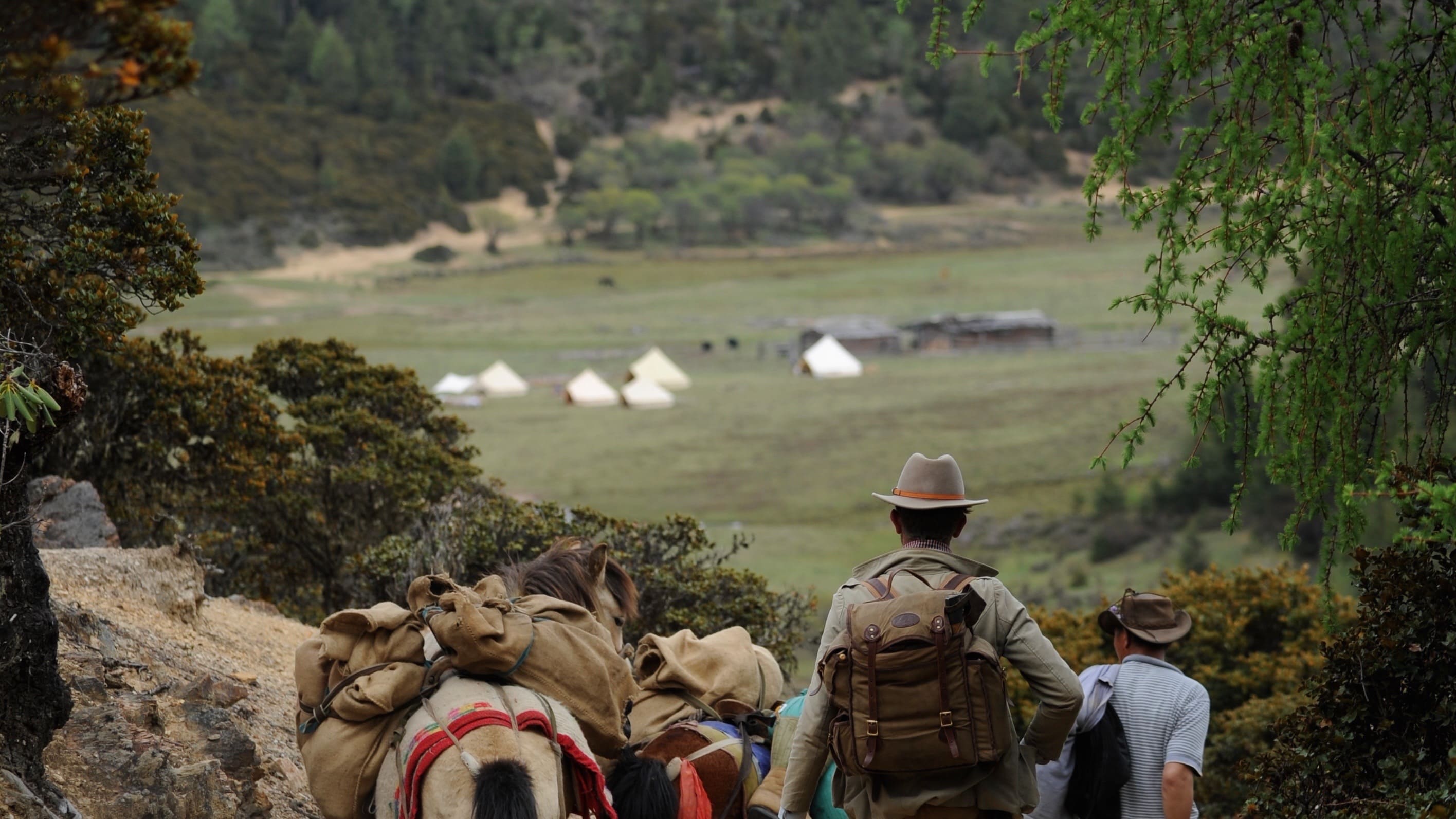 Le voyage se vit en mouvement : à pied ou à cheval, accompagné de muletiers issus des vallées traversées. Les itinéraires serpentent entre forêts, cols d’altitude et plateaux isolés, souvent au-delà de 4 000 mètres. Le campement rythme les journées - montage des tentes, repas préparés sur place, nuits sous un ciel étoilé - dans une apparente simplicité.
